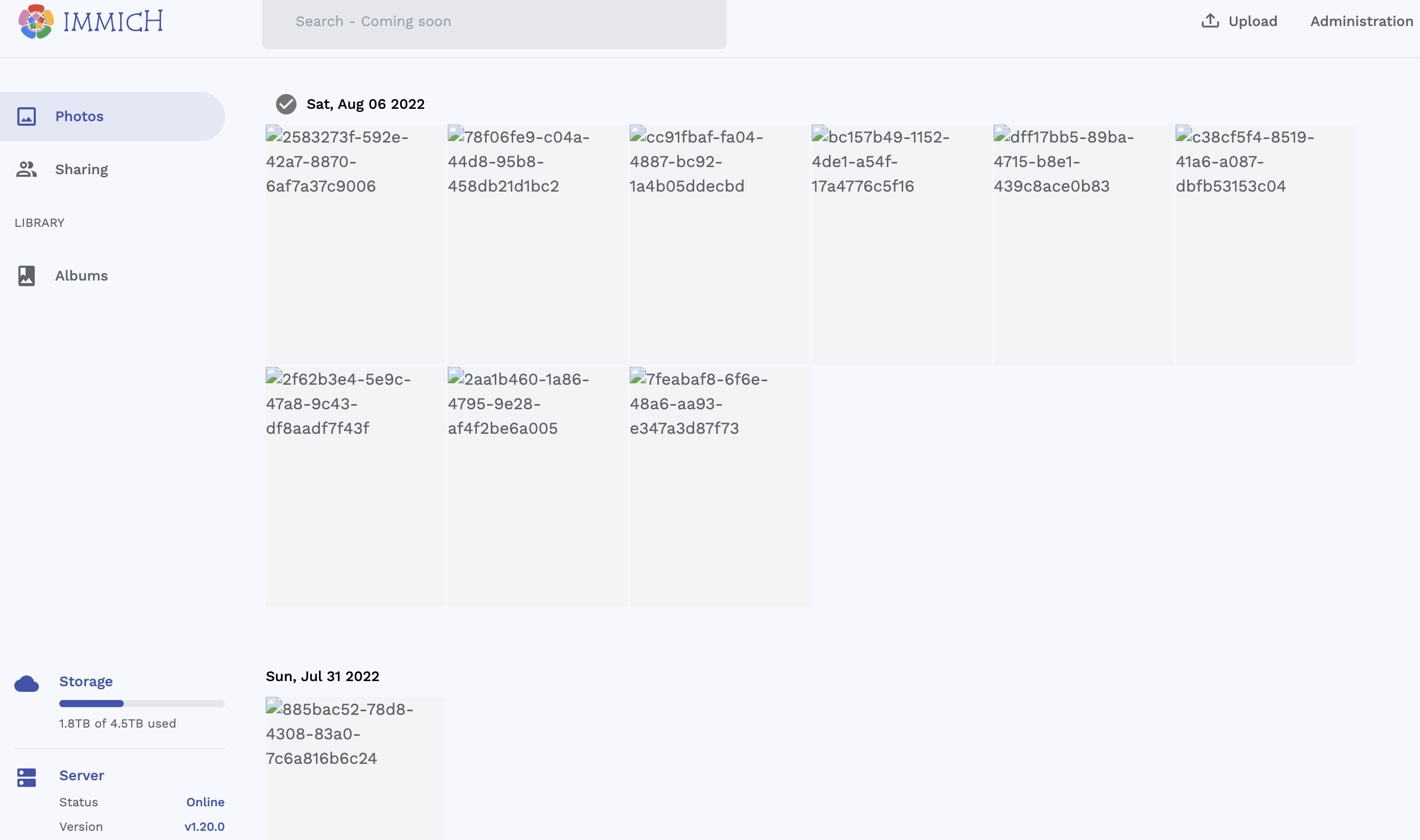 If I point my browser from a Incognito browser window or from a different machine to the immich server http://ip:2883/photos without login, the structure of the photos are viewable, including the dates, the logged in user, except that the actual photos do not load.