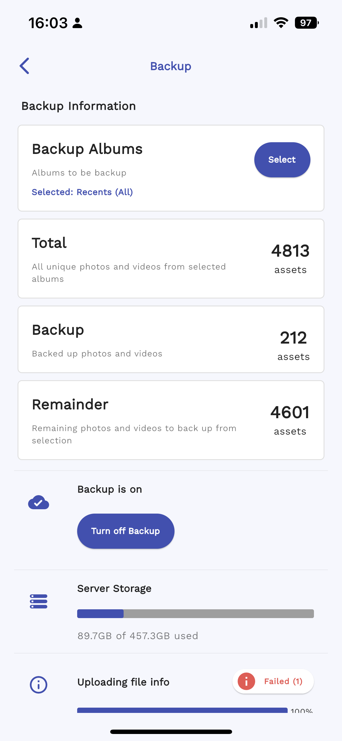 Uploading photos from App to my server doesn't seem to work. The uploading starts and after this, the server crash, only few photos were uploaded. Actually I have like 4 thousands photos from phone to upload. Please let me know how to extract a better log (logfile if exists).