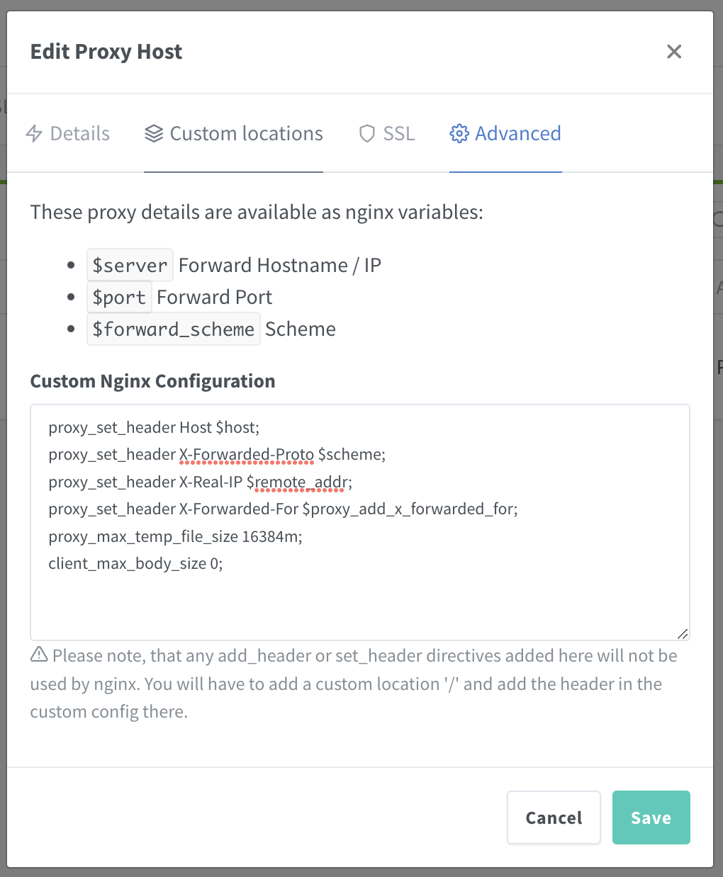 For those stumble upon this issue, if use Nginx Package Manager (npm) you should add this in the advanced tab of the proxy :