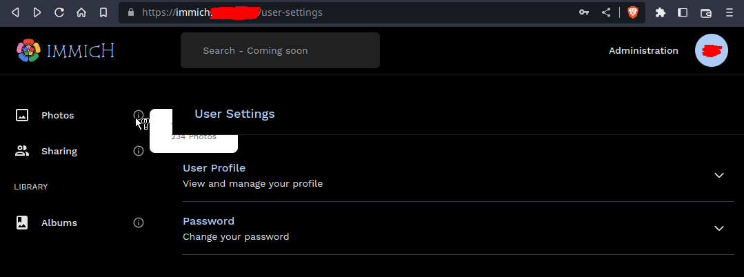 <immich-address>/user-settings. I have only tested this on the admin account, which is my only account.🛈symbol next toPhotos.Expected behavior