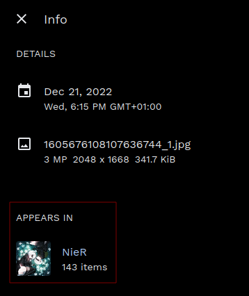 Inside the column "Info", the section "APPEARS IN" does not update with the matching album when sliding images.