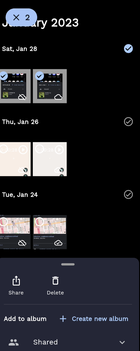 When in the multiselection view of the main timeline, e.g., tapping the back button in Android (iOS has no such functionality) exits the app. I would expect it to deselect all of your photos and hide the bottom sheet. In other words, I expect it take you back to a non-multiselection state, or just the normal browsing activity.