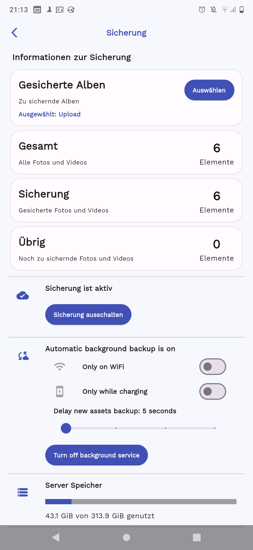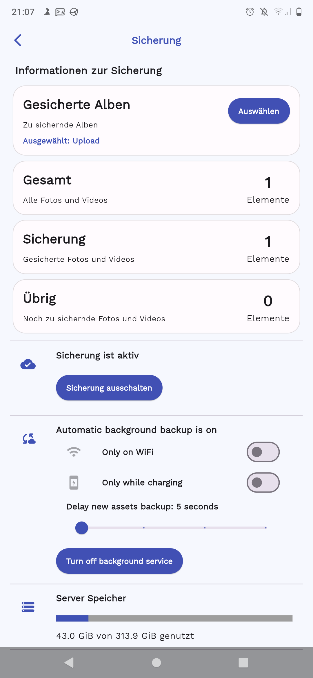 The Upload folder is configured in the Immich App: