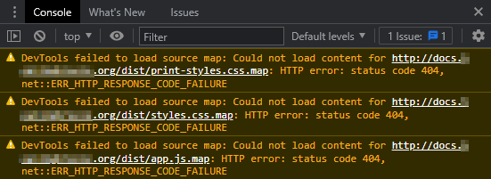 When using Chrome's inspect view there are 404 warnings trying to load content for styles.css.map, print-styles.css.map and app.js.map.