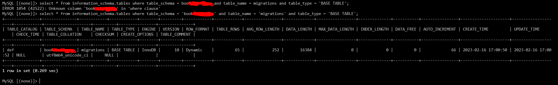 select * from information_schema.tables where table_schema = 'book_db' and table_name = 'migrations' and table_type = 'BASE TABLE'So MAYBE add clauses might solve this. By the way, this user has no root power neither can be done since run over a SaaS MySQL in Azure.