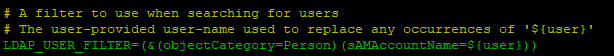 LDAP_USER_FILTERvariable.I'm not sure if objects in active directory have a