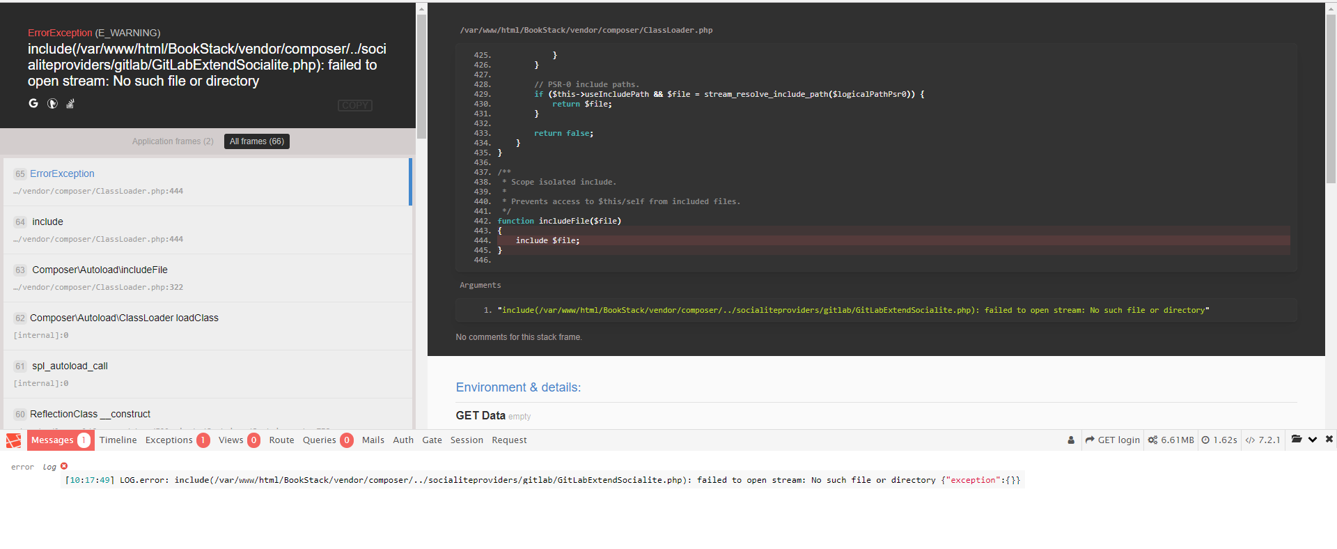 include(/var/www/html/BookStack/vendor/composer/../socialiteproviders/gitlab/GitLabExtendSocialite.php): failed to open stream: No such file or directory