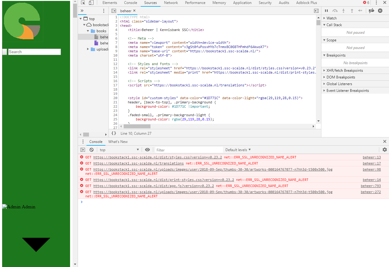 I can reproduce this error when I call https://bookstack1.ssc-scalda.nl here. I did a scan at ssllabs and it tells me, that no secure protocols are supported, so this seems to be a problem in the nginx configuration. Is nginx configured to serve bookstack1.ssc-scalda.nl?sorry about that.Did you restart your server in the meantime, or at least php7.1-fpm? I once had similar issues in Homestead until I did a restart. In your last post the URLs seem to be replaced properly, but not in your first post, so this might be a problem here too.