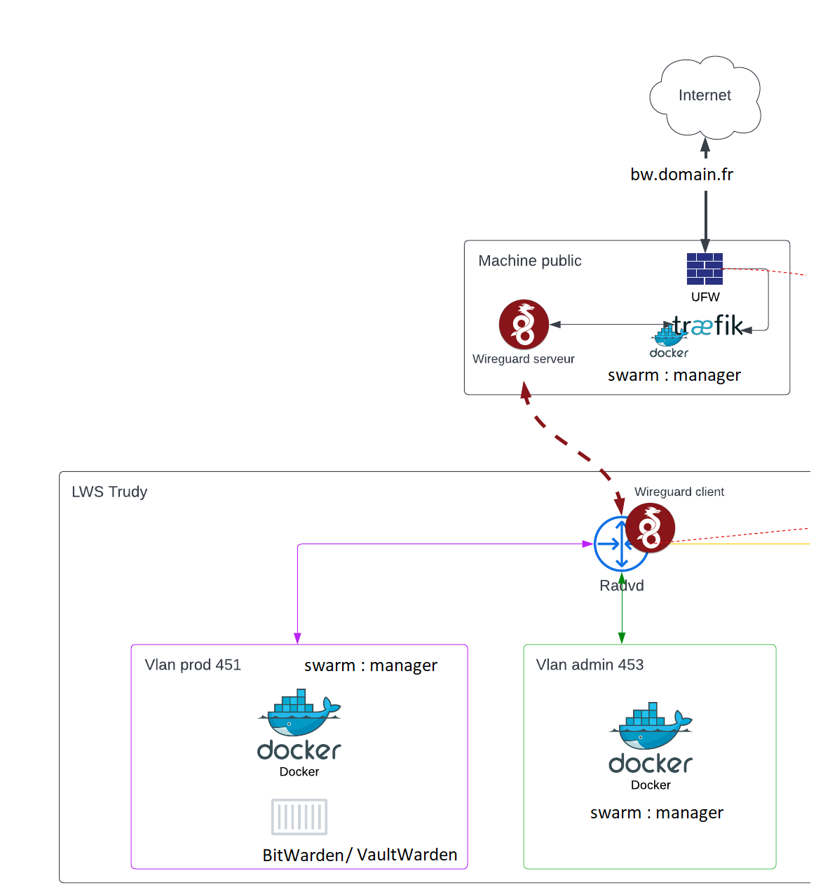 We are using Vaultwarden in university project. The following docker-compose file is running on a docker swarm stack composed by 3 nodes : public, admin and prod.