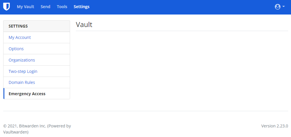 Just to try, I have configured an emergency access (with view access rights) and it is well approved but when I click on the View button of the emergency contact I can't see anything (see picture below). Is that normal ? I am redirecting to https://my.vaultwarden.server.com/#/settings/emergency-access/54a8de73-1da6-4578-b46f-358868d8cba4. What am I supposed to do then ?