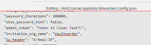 I'm using the Vaultwarden docker container and was a little bit suprised seeing the admin token in clear text in /data/config.json: