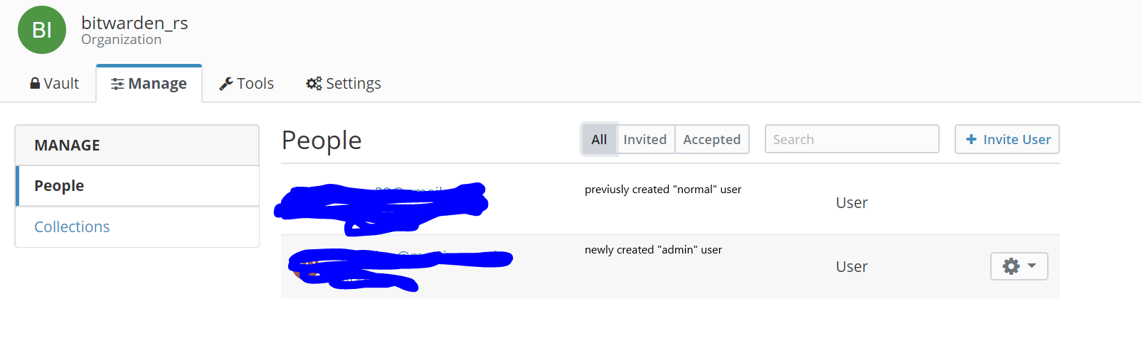 "Normal" user do not belong to bitwarden_rs organization #128