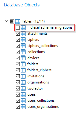 The first issue was that the table structure needed to be in place in MySQL before I migrated data. So I started the MySQL-enabled version of bitwarden_rs for a second and stopped it again, enough time to create all the tables and apply all the schema migrations.