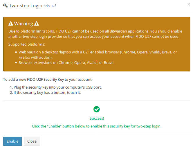 u2fbranch (https://github.com/dani-garcia/bitwarden_rs/tree/u2f). I'd appreciate if you would be able to test it before merging it. It works for me on a virtual device on MacOS Chrome, but I lack a real device to test it on.Note: You need to be using HTTPS and you need to set the