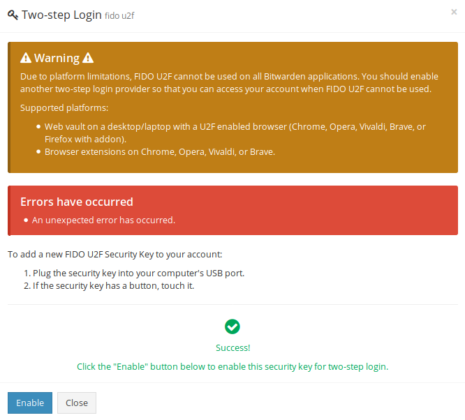 When one attempts to enable U2F, they get an error in the web UI, as well as a log error from the app:
