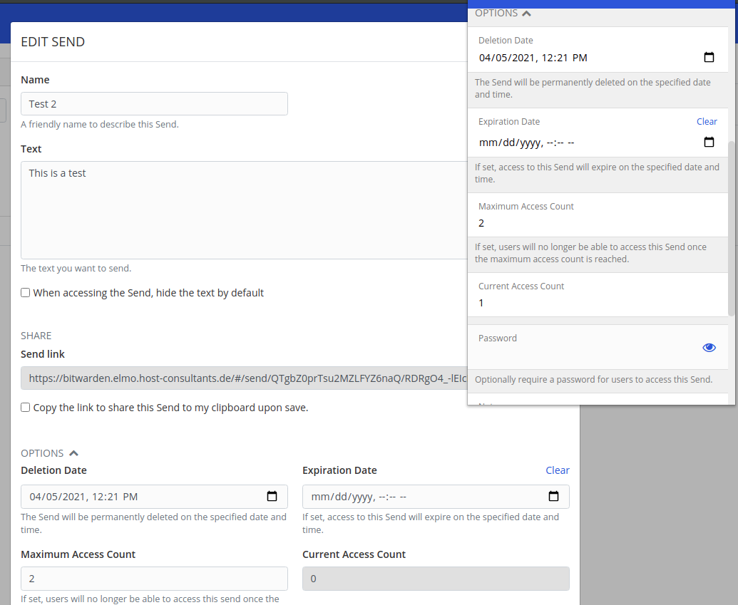 The send feature allow to expire items once it has been requested a given amount of times. This in itself also word (e.g. saying a link should have a "maximum access count" of two, no longer works when visiting it for the third time. However the gui also has a field "current access count" which looks like it should show how often an item has been requested already, but this seems to be stuck a "0".